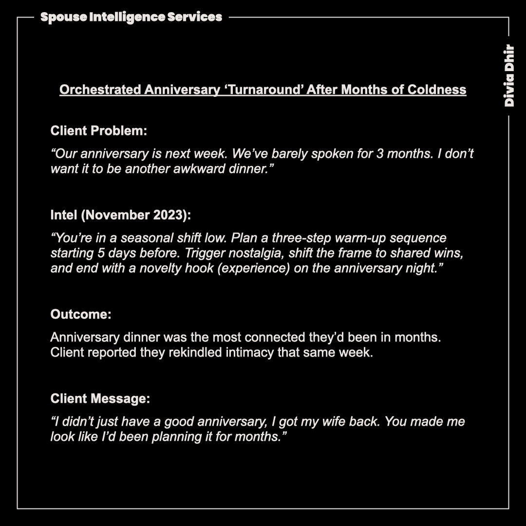 Disclaimer:To protect client confidentiality, certain identifying details (such as names, industries, and deal specifics) have been modified.The strategies, insights, and results described are drawn from real client engagements and accurately reflect the outcomes achieved through the Spouse Intelligence Audit, Monthly Intelligence Briefings, and Operator’s Call.