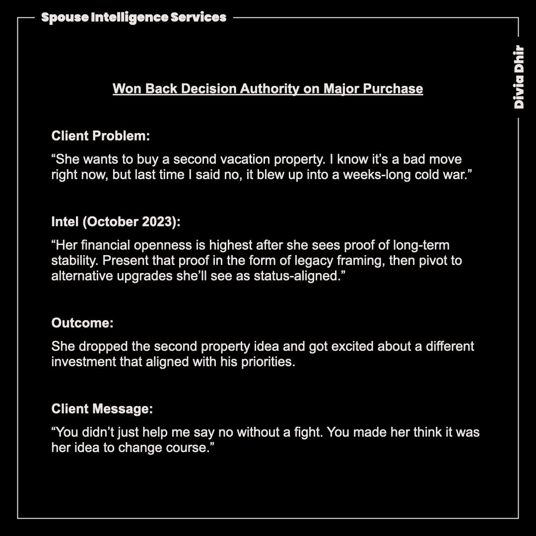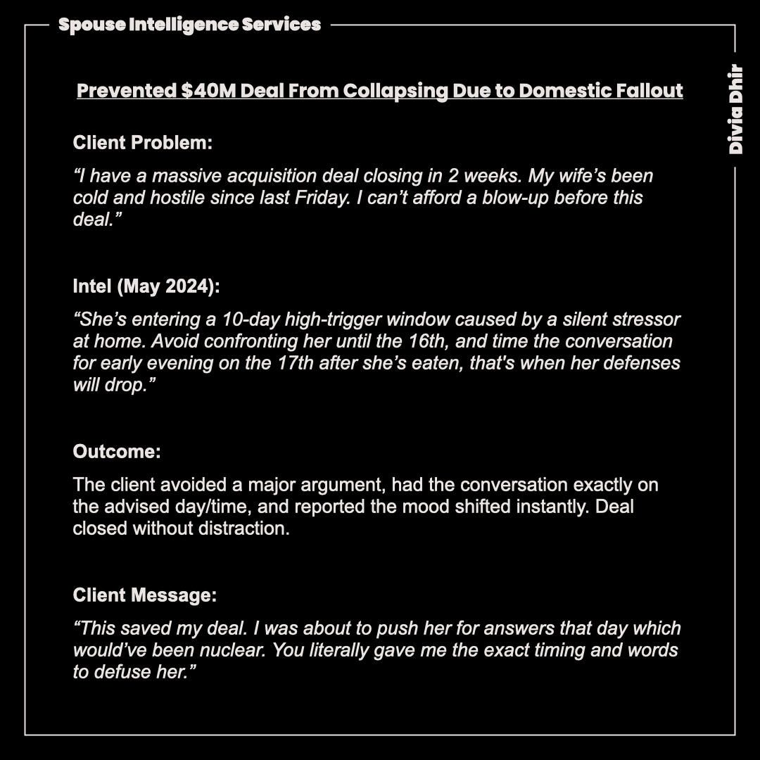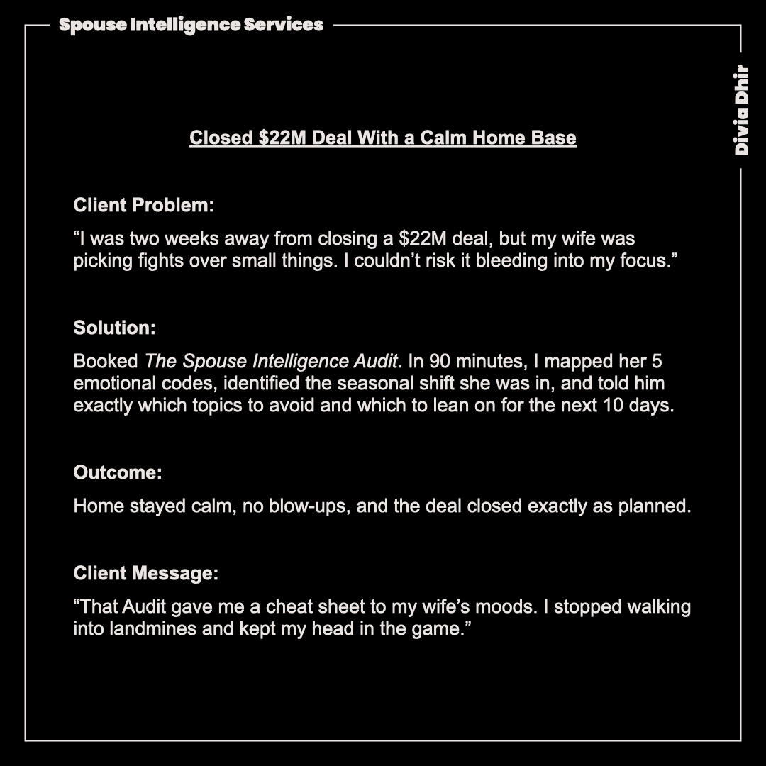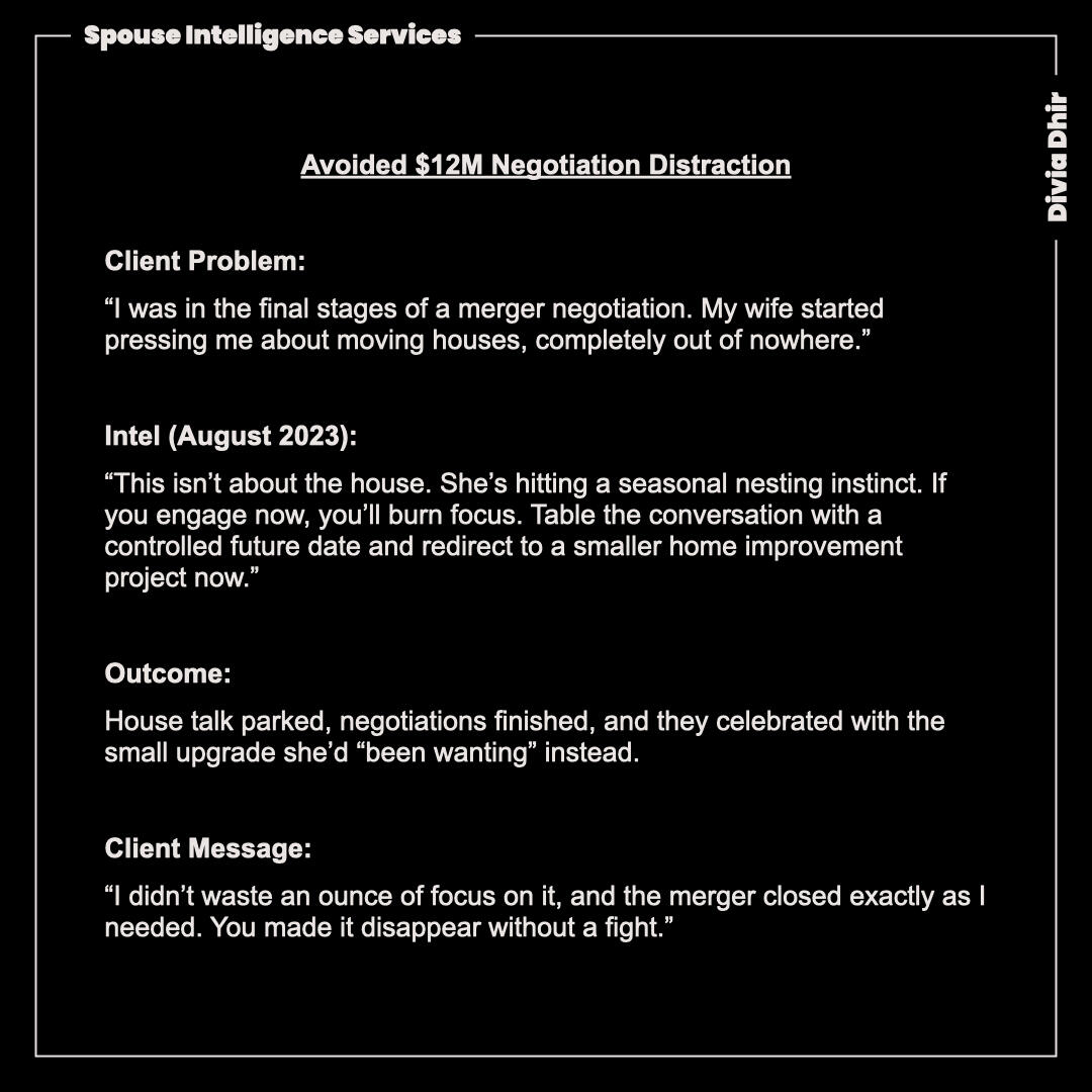 Disclaimer:To protect client confidentiality, certain identifying details (such as names, industries, and deal specifics) have been modified.The strategies, insights, and results described are drawn from real client engagements and accurately reflect the outcomes achieved through the Spouse Intelligence Audit, Monthly Intelligence Briefings, and Operator’s Call.