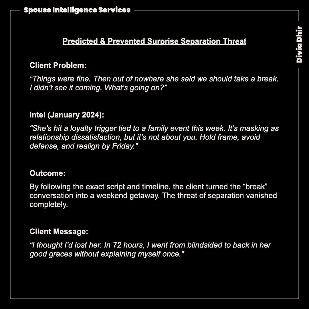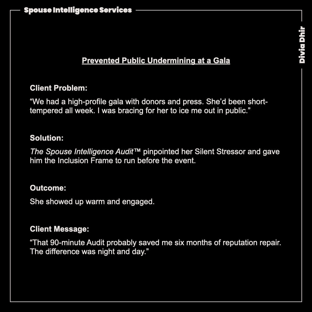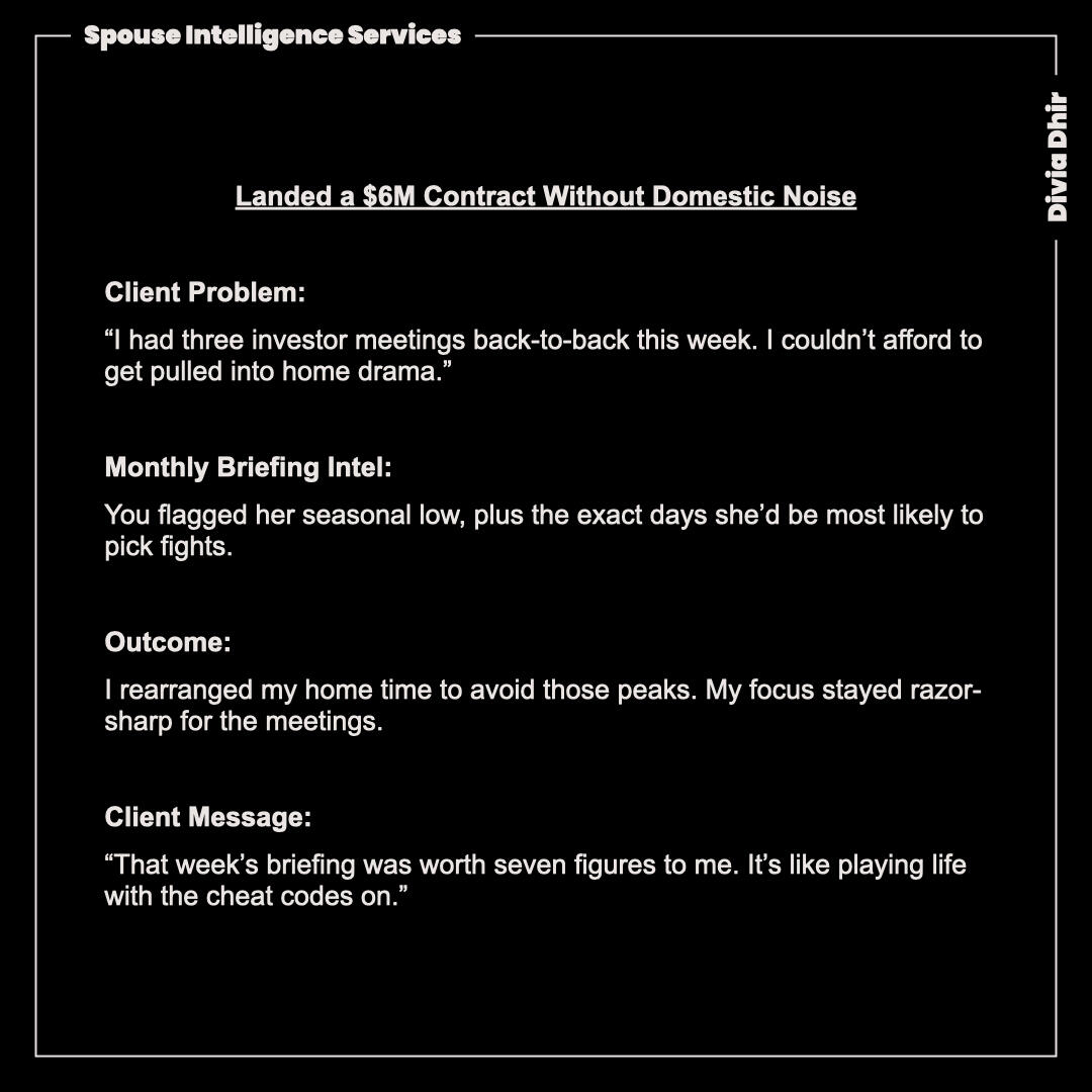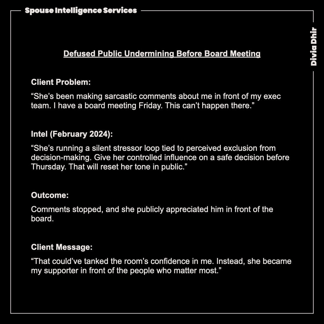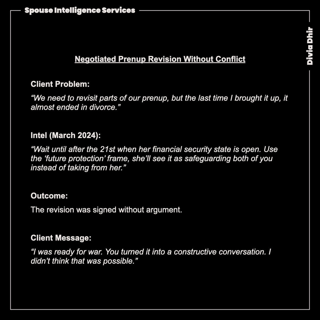 Disclaimer:To protect client confidentiality, certain identifying details (such as names, industries, and deal specifics) have been modified.The strategies, insights, and results described are drawn from real client engagements and accurately reflect the outcomes achieved through the Spouse Intelligence Audit, Monthly Intelligence Briefings, and Operator’s Call.