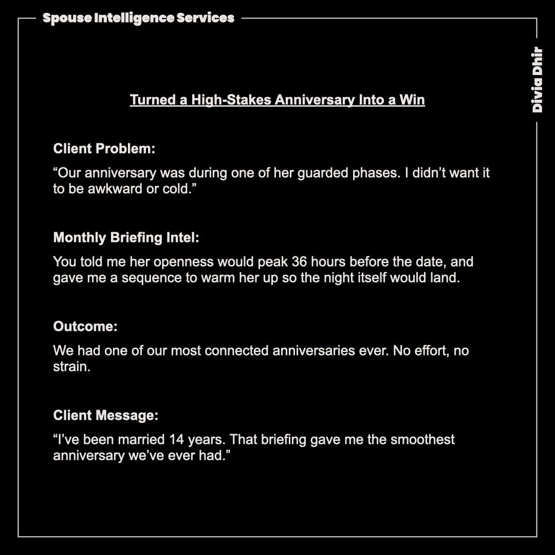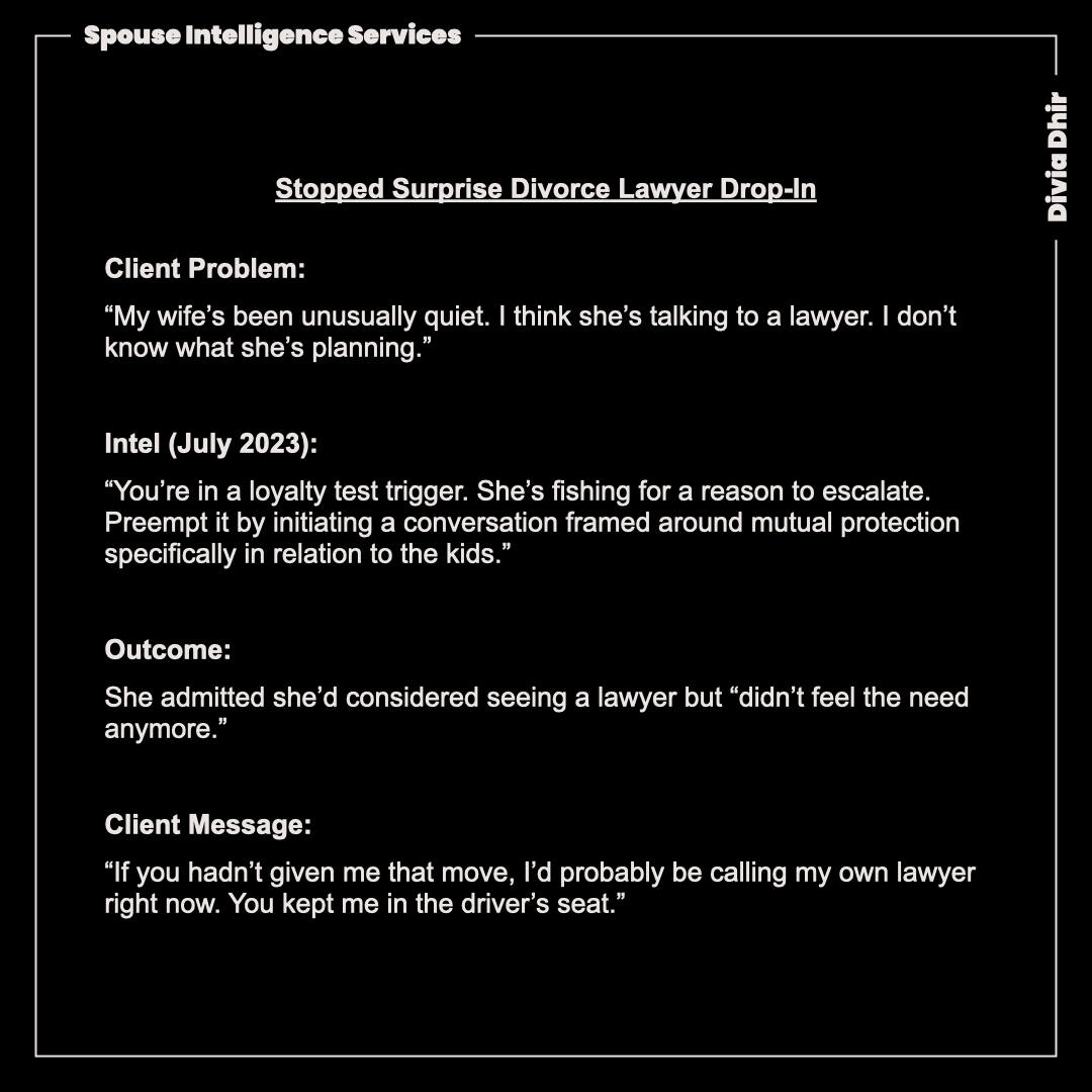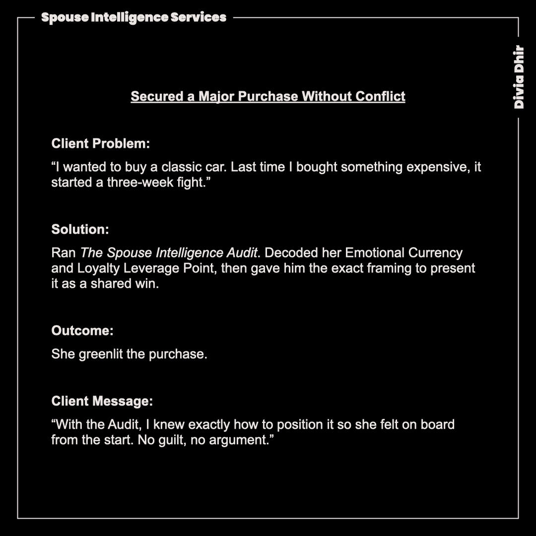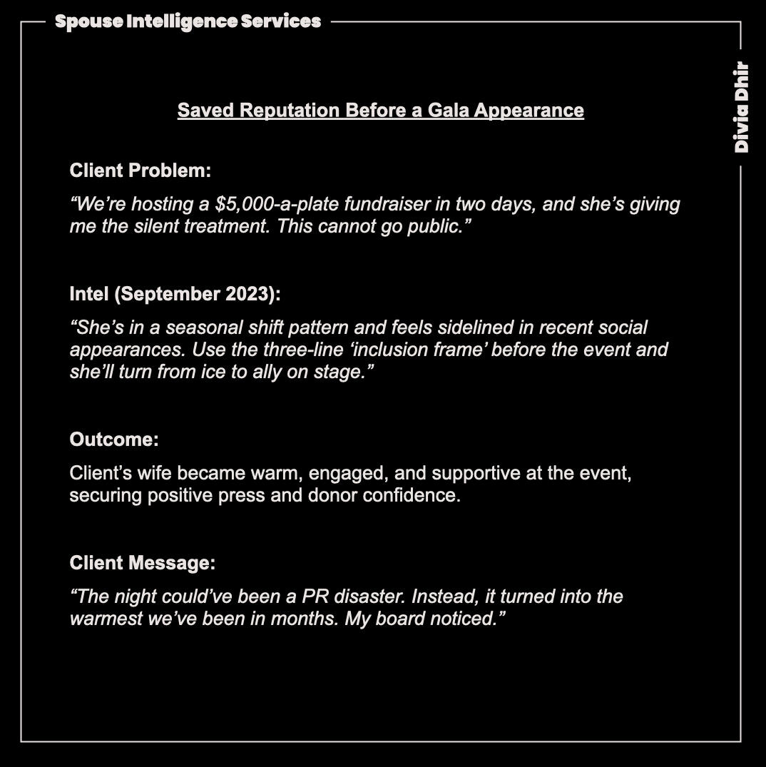 Disclaimer:To protect client confidentiality, certain identifying details (such as names, industries, and deal specifics) have been modified.The strategies, insights, and results described are drawn from real client engagements and accurately reflect the outcomes achieved through the Spouse Intelligence Audit, Monthly Intelligence Briefings, and Operator’s Call.
