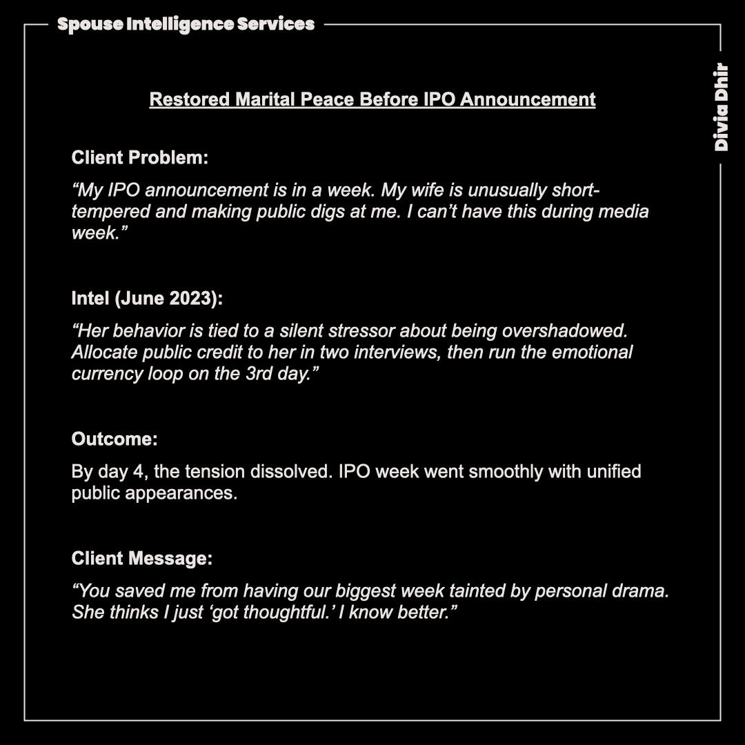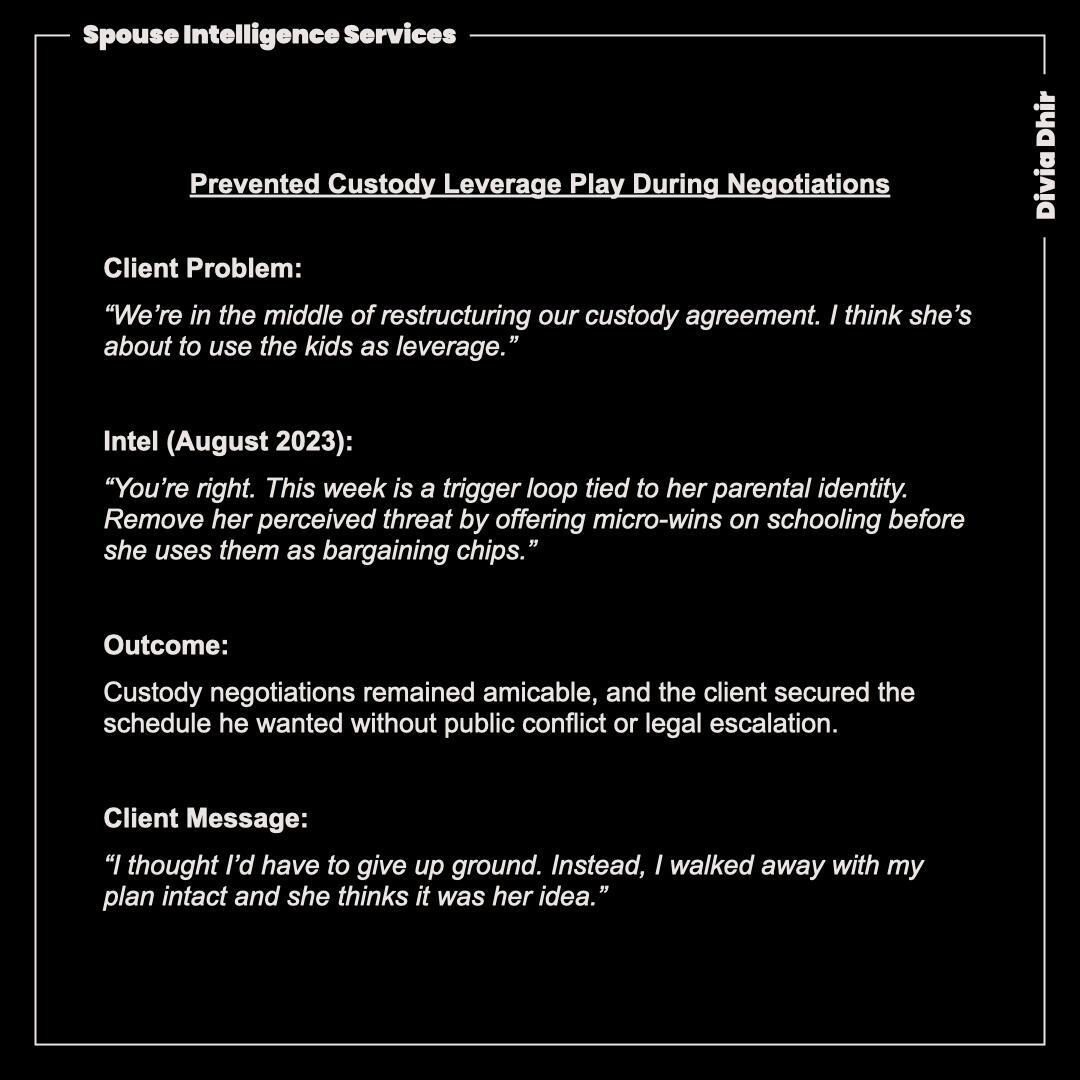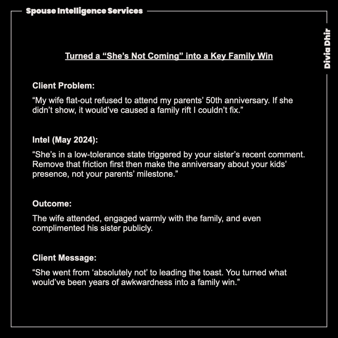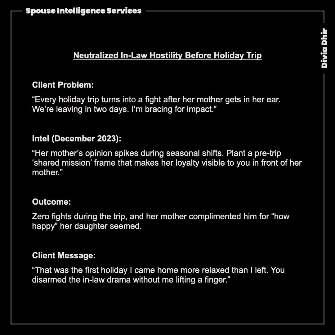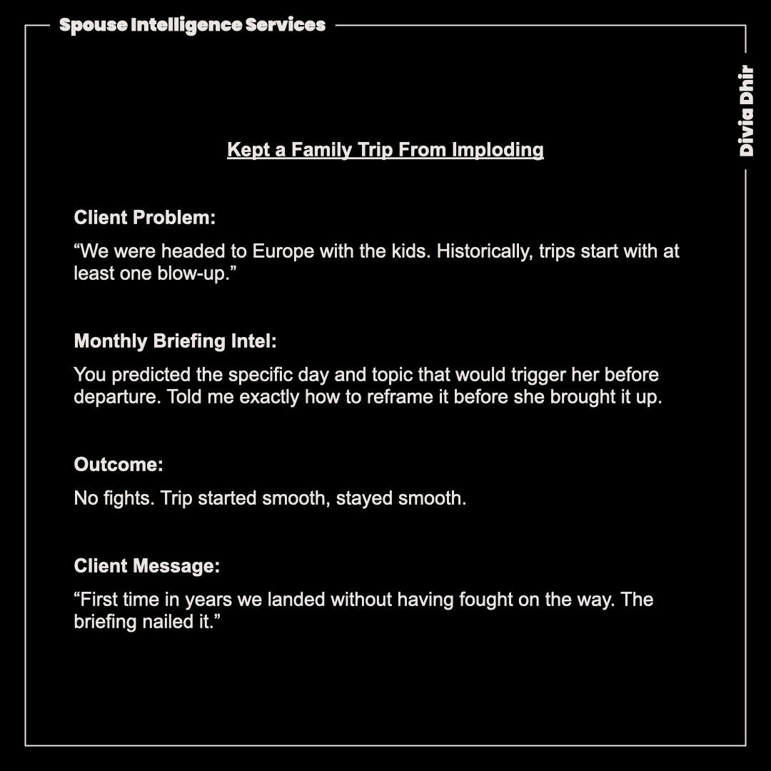 Disclaimer:To protect client confidentiality, certain identifying details (such as names, industries, and deal specifics) have been modified.The strategies, insights, and results described are drawn from real client engagements and accurately reflect the outcomes achieved through the Spouse Intelligence Audit, Monthly Intelligence Briefings, and Operator’s Call.