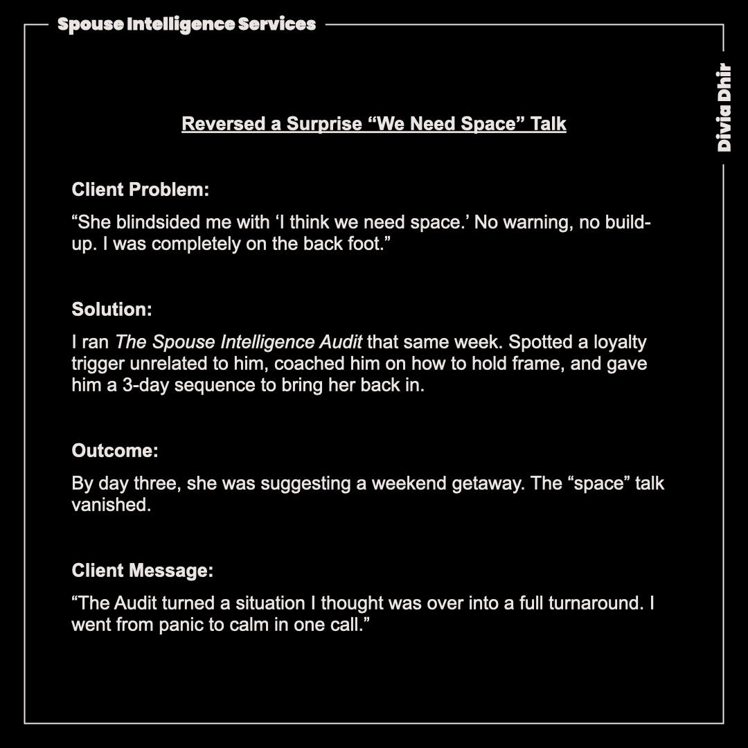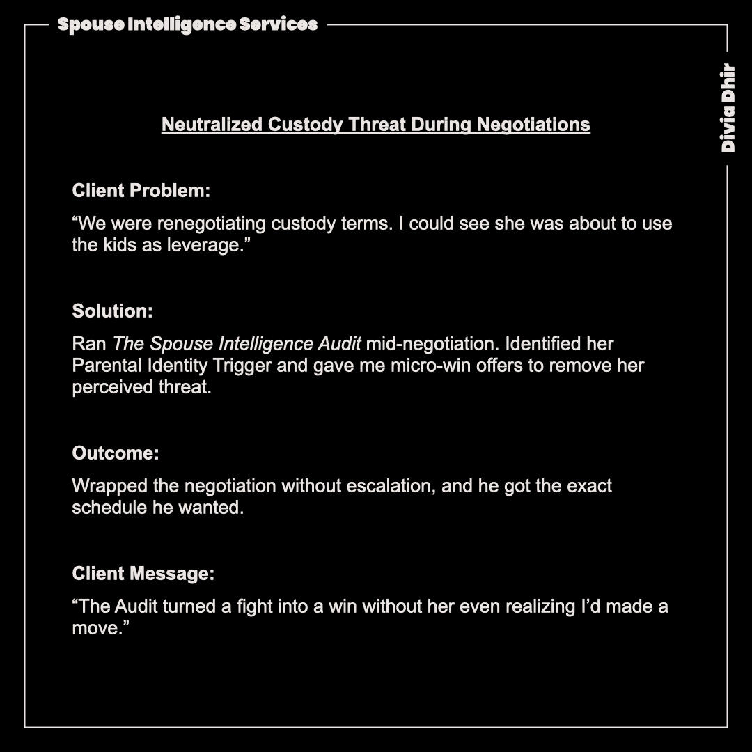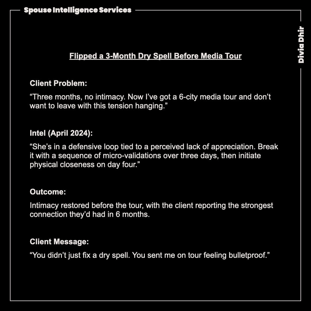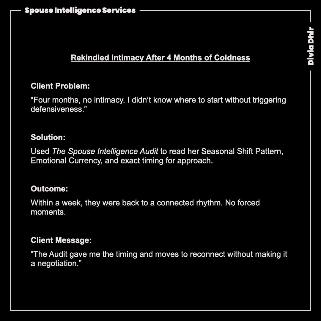 Disclaimer:To protect client confidentiality, certain identifying details (such as names, industries, and deal specifics) have been modified.The strategies, insights, and results described are drawn from real client engagements and accurately reflect the outcomes achieved through the Spouse Intelligence Audit, Monthly Intelligence Briefings, and Operator’s Call.